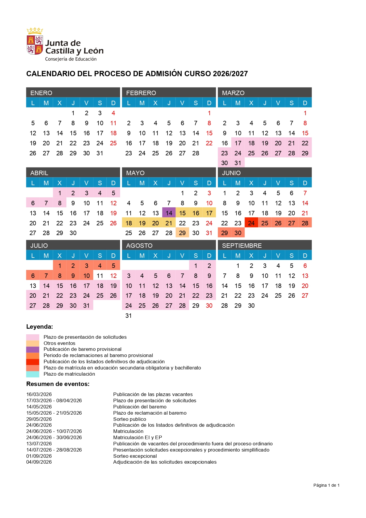 CALENDARIO DE ADMISIÓN CURSO 2026-2027